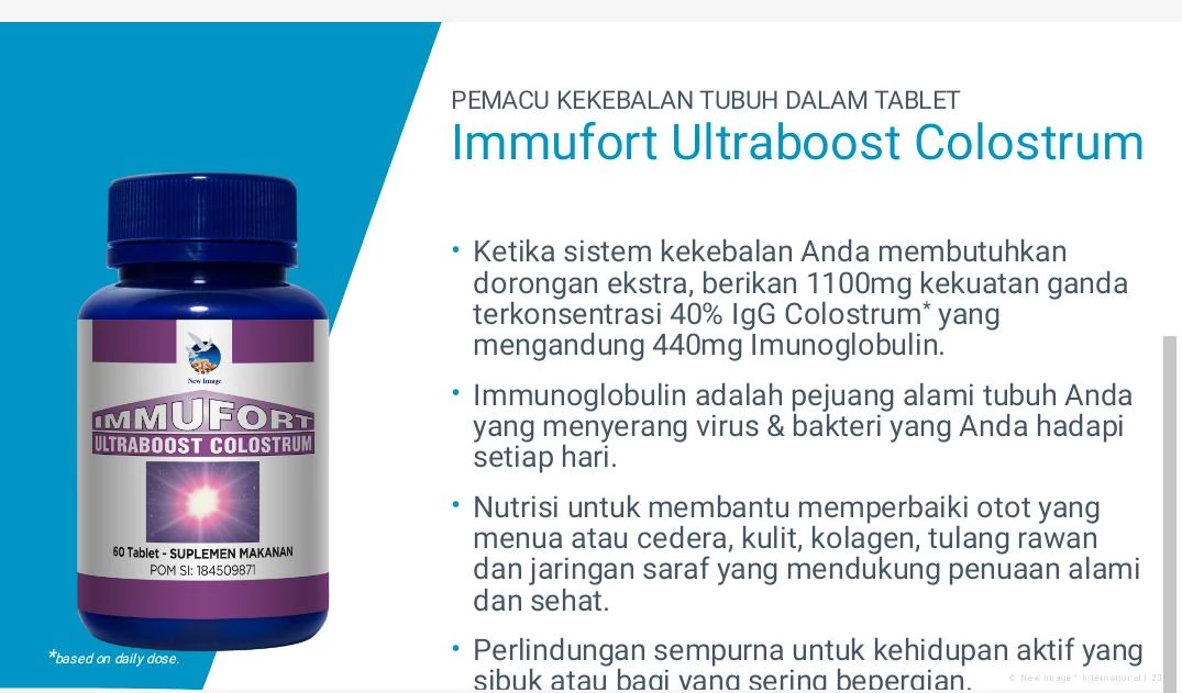 "Jaga imunitas harian dengan Immufort Ultrabost Colostrum, suplemen alami kaya imunoglobulin yang membantu melawan virus & menjaga vitalitas tubuh."